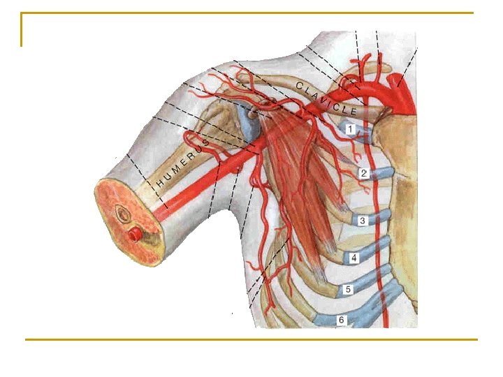 Arteries of upper limb Axillary artery n n n Continuation of subclavian artery at lateral border of first rib Becomes brachial artery at lower border of teres major Divided into three parts by overlying pectoralis minor q q q First portion, above muscle-gives rise to thoracoacromial a. Second portion, behind muscle-gives rise to lateral thoracic a. Third portion, below muscle-gives rise to subscapular a. , anterior and posterior humeral circumflex a. ; the former then divides into throcodorsal a. and circumflex scapular a.