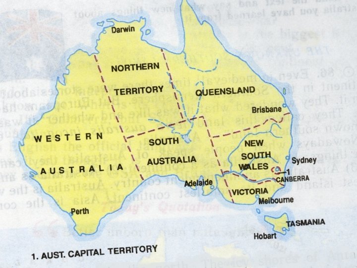 Say true or false. If false, correct this statement. • 1 Australia is the smallest continent in the world. • 2 Australia is situated in the Southern Hemisphere. • 3 Vast areas of desert cover most of Central and Western Australia. • 4 Melbourne is the capital of Victoria. • 5 The official name of the country is the Commonwealth of Australia. • 6 There are 6 states in Australia and two territories. • 7 Tasmania is an island state. • 8 Australia is washed by the waters of two oceans. • 9 Most people live in the coasts of the east and south – east of the country.