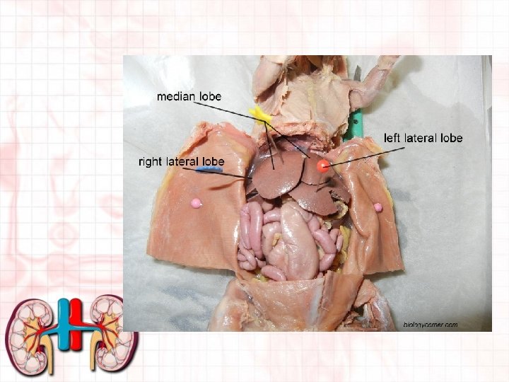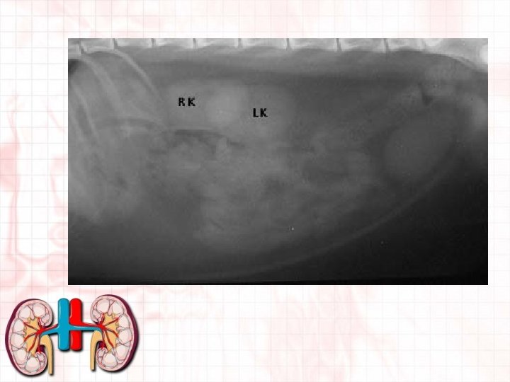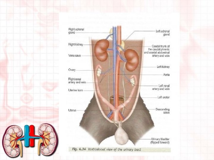 Location of the kidneys • In dorsal part of abdomen • Ventral to and on either side of first few lumbar vertebrae. • In most domestic animals, right kidney is slightly more cranial than left. • Perirenal fat surrounds and helps protect from exertion from other organs. • Are retroperitoneal to the abdominal cavity and so are considered outside abdominal cavity. • Move somewhat with the movement of the diaphragm • Position may vary with species.