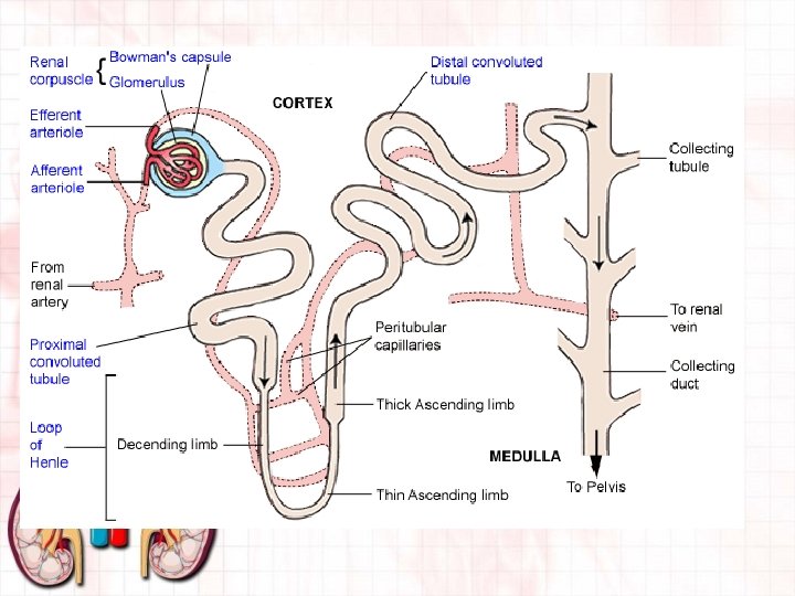 Microscopic Anatomy of the Kidney • Nephrons- basic functional unit of the kidney whose job is to filter, reabsorb and secrete. – Smallest part of the kidney – Number varies per kidney and species • Medium sized dog is about 700, 000 – Composed of: • Renal Corpuscle • Proximal Convoluted Tubule (PCT) • Loop of Henle • Distal Convoluted Tubule (DCT) https: //youtu. be/hi. NEShg 6 JTI
