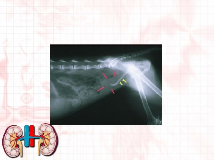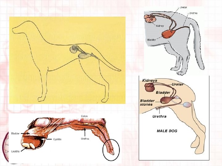 Obstructions • If crystal or stone becomes lodged in urethra can obstruct flow of urine. • May also be caused by tumor. • What we called “blocked” • Feline Lower Urinary Tract Disease. • May need to treat as emergency surgery or place catheter to flush back stone to bladder to dissolve or remove. • If not treated can lead to bladder rupture