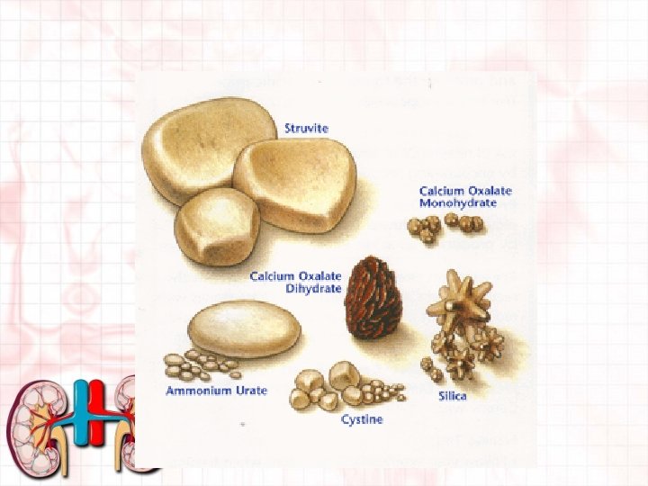 Uroliths and Urolithiasis • Uroliths- aggregates of crystals in the urine that may become urolithiasis. • Urolithiasis- the presence of urinary stones in the bladder. • Usually are formed when the p. H of the urine is too low or too high. • Bacterial infections or diet may influence the p. H levels. • May have a mixed stone.