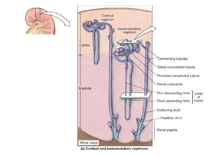 The Nephron • • Renal corpuscle Proximal convoluted tubule (PCT) Loop of Henle (nephron loop) Distal convoluted tubule (DCT) – Then on to collecting system • Connecting tubule • Collecting duct • Papillary duct