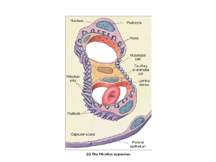 Glomerulus – Fenestrated Capillary bed • Thick membrane – Lamina densa • Blood arrives at vascular pole of glomerulus – Afferent arteriole • Blood departs via efferent arteriole – Peritubular capillaries – Vasa recta