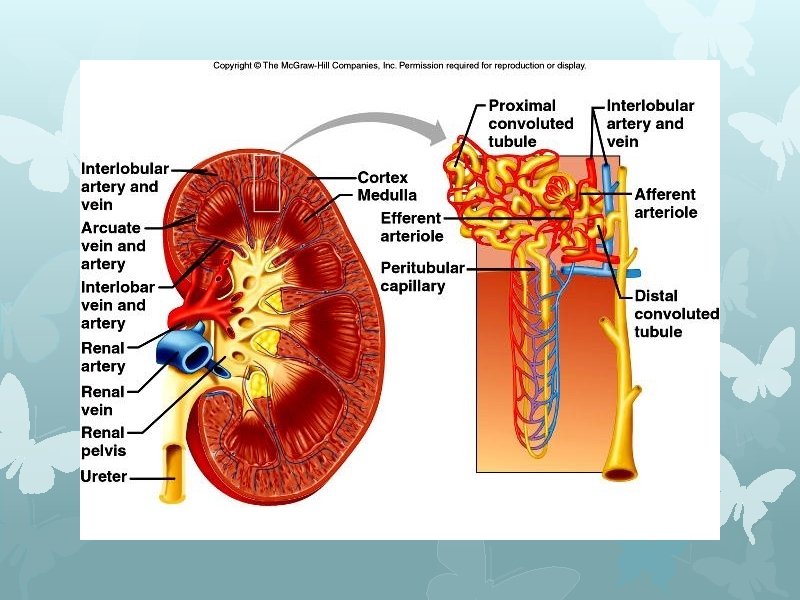 Renal Arteries & Veins • Arteries attach to the abdominal aorta • Veins attach to the inferior vena cava Interlobar arteries pass between the renal pyramids Afferent arterioles lead to the nephrons