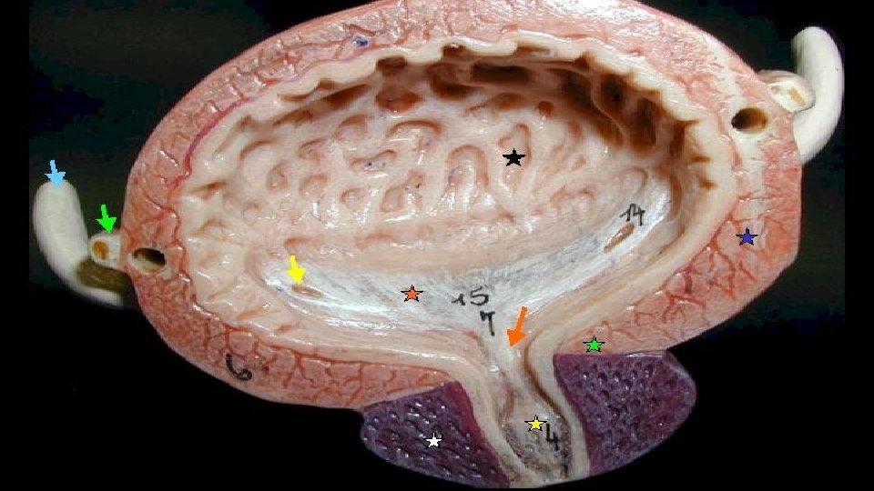 Bladder 1. A hollow distensible storage unit for urine 2. Has the same 4 layers as the alimentary canal 3. The trigone are the 3 holes of the bladder. 2 are for the ureters and one for the urethra