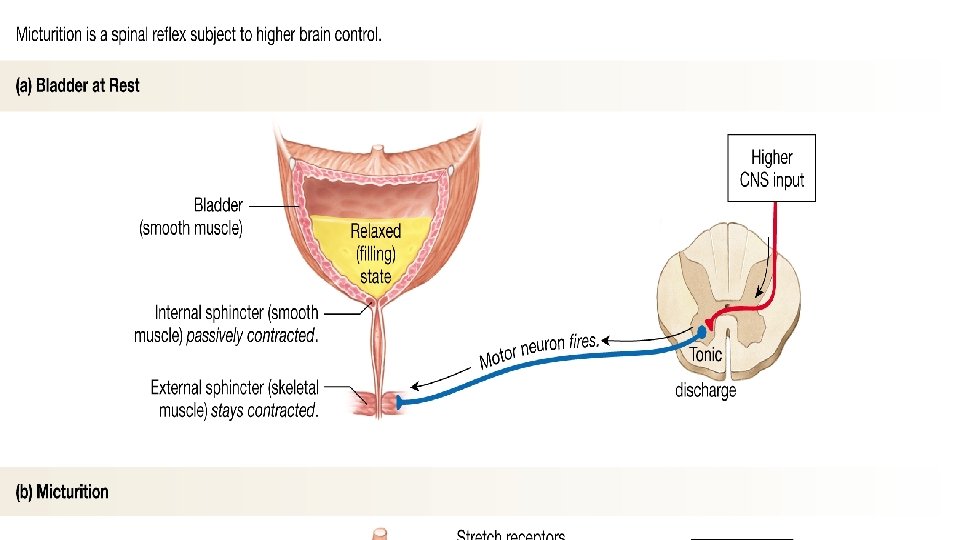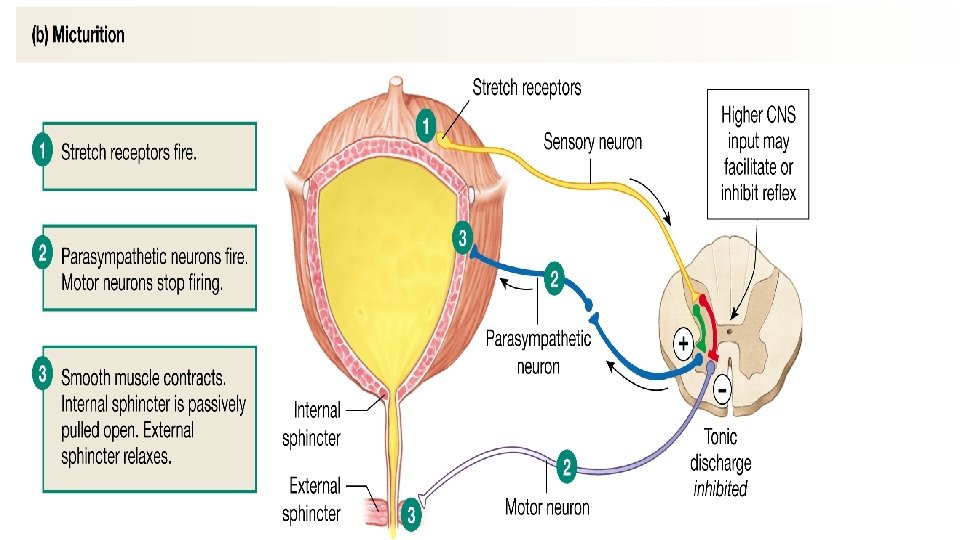 C. Micturition is the process of expelling urine from the bladder. The filling of the bladder signal stretch receptors that send messages to the micturition reflex center in the spinal cord. Parasympathetic impulses cause the detrusor muscle to contract the bladder. This occurs at around 150 ml of urine. The external urethral sphincter voluntarily relaxes to let the urine escape.