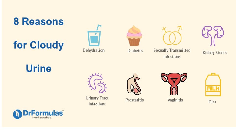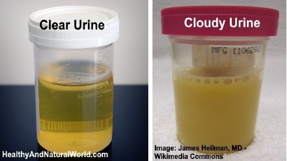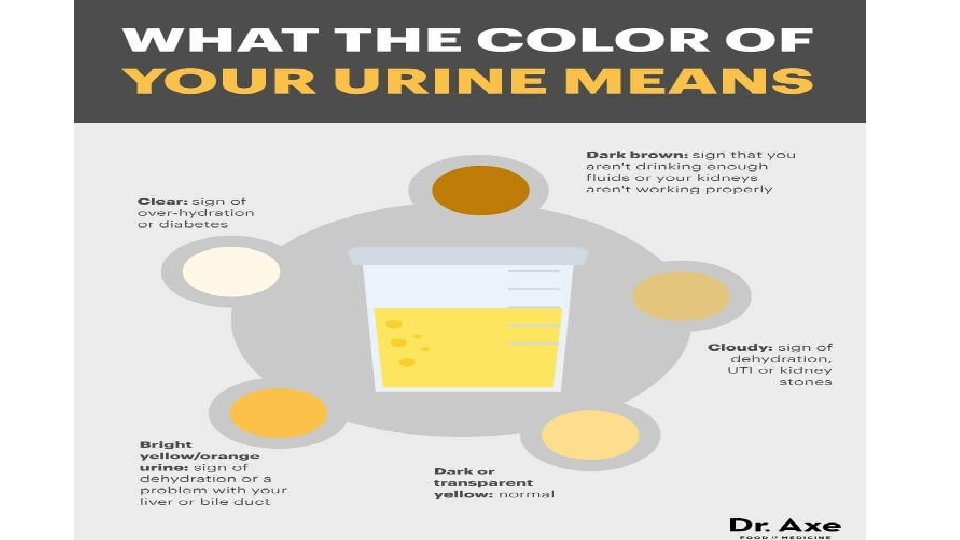 Urine Characteristics 1. Byproduct of kidney’s activities 2. Urinalysis – the testing of a urine sample – see reference sheet for abnormal urine examples 3. Daily volume 1500 ml 4. Transparent 5. Slight odor 6. p. H 6. 0 7. 95% water
