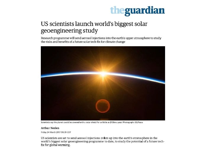 Geoengineering - “Plan B”? • Geoengineering is the deliberate large-scale manipulation of the planetary environment to counteract anthropogenic climate change • Treated as a fringe subject for decades, and still controversial • Key turning point: proposal by Dr. Paul Crutzen in 2006