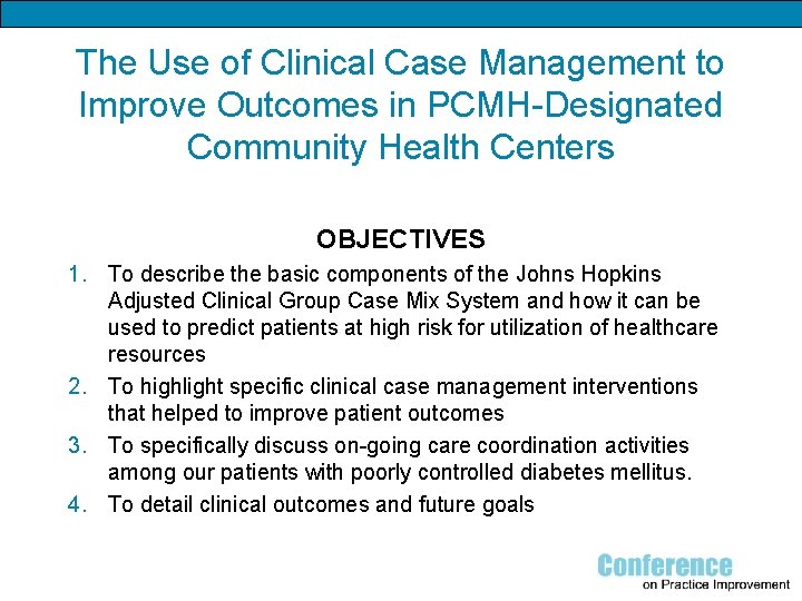 The Use of Clinical Case Management to Improve Outcomes in PCMH-Designated Community Health Centers OBJECTIVES 1. To describe the basic components of the Johns Hopkins Adjusted Clinical Group Case Mix System and how it can be used to predict patients at high risk for utilization of healthcare resources 2. To highlight specific clinical case management interventions that helped to improve patient outcomes 3. To specifically discuss on-going care coordination activities among our patients with poorly controlled diabetes mellitus. 4. To detail clinical outcomes and future goals