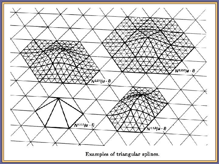 Triangular Splines • A triangular spline surface : ( ¤) Sr ; s; t (u) = X dri ; s; t N r ; s; t (u ¡ i); u 2 R 2; i 2 Z 2 i where N r ; s; t (u) : a normalized triangular spline of degree (r+s+t-2)