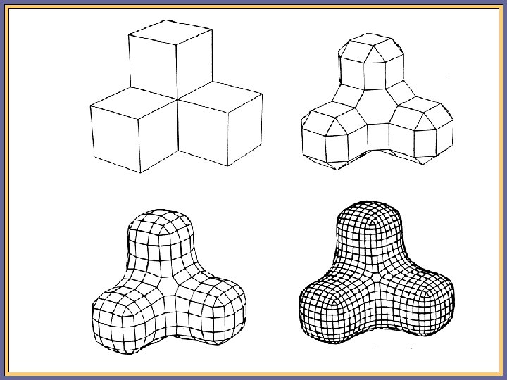 • New face points : q 11 = P 11 + P 12 + P 21 + P 22 4 • New edge points : q 12 = C+ D 2 + P 1 2 + P 2 2 ; C = q 11 ; D = q 13 • New vertex points : q 22 = Q R P 22 + + 4 2 4 q 11 + q 13 + q 31 + q 33 4 ·µ ¶ µ ¶ µ ¶¸ 1 p 22 + p 12 p 22 + p 21 p 22 + p 32 p 22 + p 23 + + + R= 4 2 2 Q=