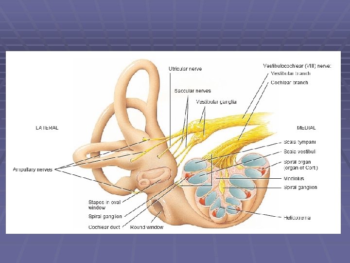 Ménière Disease results from a disruption of normal endolymph volume Symptoms include: Severe vertigo Positional nystagmus (nystagmus when head in a particular position) Nausea Affected individuals can also experience-unpredictable attacks of auditory & vestibular symptoms: Vomiting Tinnitus (ringing in ears) Inability to make head movements Inability to stand passively Low frequency hearing loss Treatment: administration of a diuretic (hydrochlorothiazide) & a salt restricted diet Persistent condition: shunt implantation into swollen endolymphatic sac, or delivery of a vestibulotoxic agents (gentamicin) into perilymph.