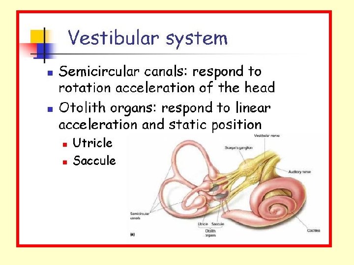 VESTIBULAR SYSTEM Ø A central role in the maintenance of equilibrium and gaze stability. Ø The vestibular system, by means of its receptors for the perception of linear and angular acceleration, plays a central role in orientation. Designed to answer two basic questions: ¨ Which way is up? ¨ Where am I going?