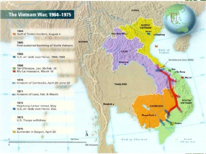 Paris Peace Accords 1973 z Conditions: 1. U. S. to remove all troops 2. North Vietnam could leave troops already in S. V. 3. Demilitarized buffer zone separating the two sides 4. North Vietnam would resume war 5. No provision for POWs or MIAs z Last American troops left South Vietnam on March 29, 1973 z 1975: North Vietnam defeats South Vietnam z Saigon renamed Ho Chi Minh City