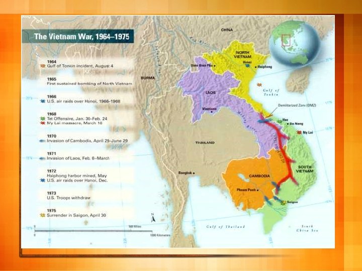 July 1969 - President Nixon orders the first of many U. S. troop withdrawals from Vietnam. l March 1972 - Easter Offensive- The North Vietnamese cross the demilitarized zone (DMZ) at the 17 th parallel to attack South Vietnam l January 27, 1973 - The Paris Peace Accords are signed that provide a cease-fire. l March 29, 1973 - The last U. S. troops are withdrawn from Vietnam. l 1. South Vietnam is on its own to fight the North