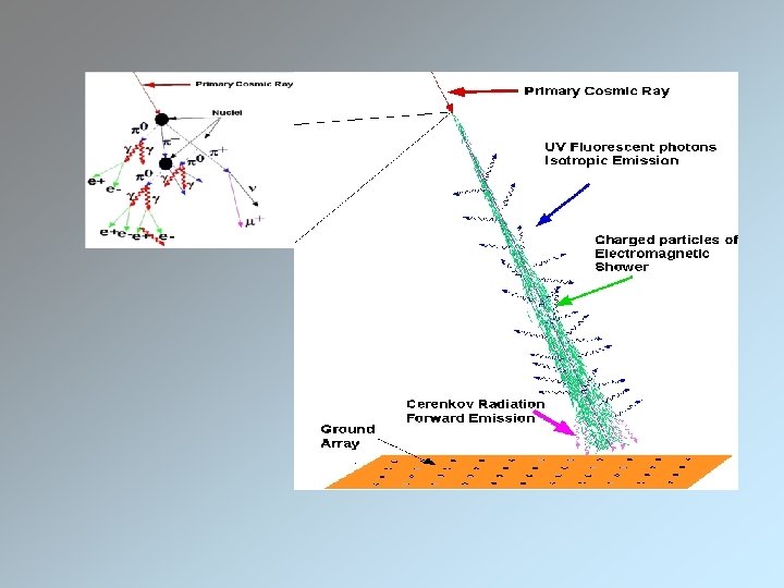 • <1014 e. V (balloon experiments, satellites) • >1014 e. V (Ground arrays, large telescopes) -fluorescence light, -cherenkov emission • >1018 e. V (AGASA, Hires, Auger, Euso*)