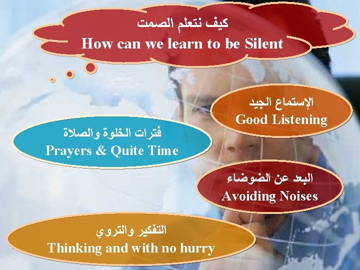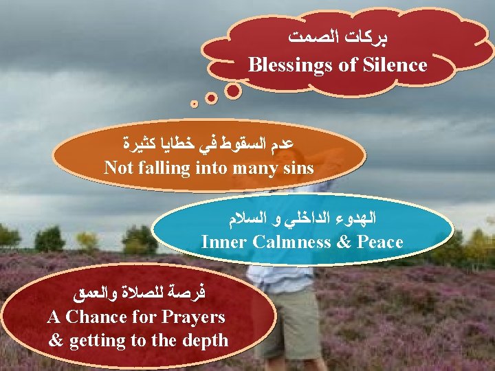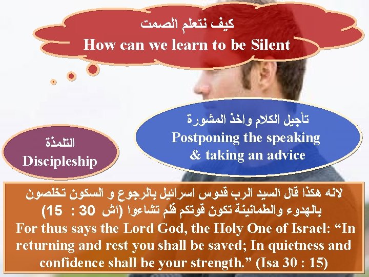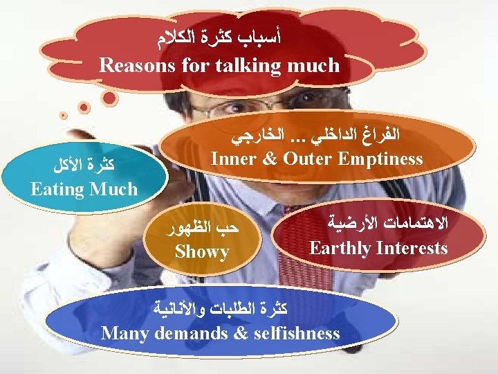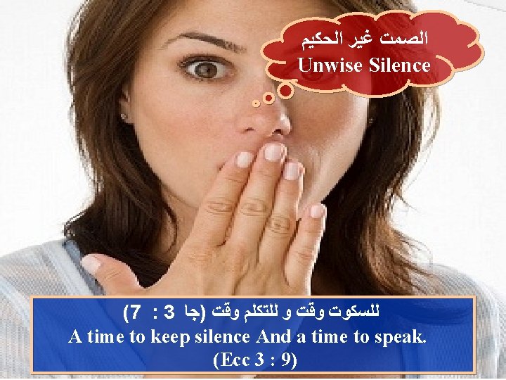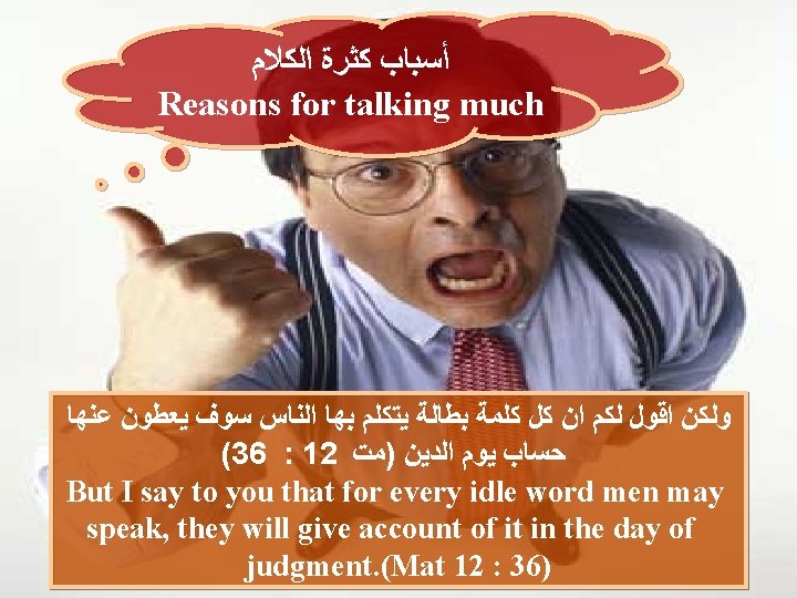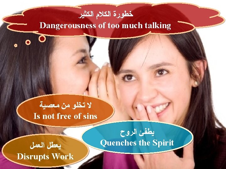 ﺧﻄﻮﺭﺓ ﺍﻟﻜﻼﻡ ﺍﻟﻜﺜﻴﺮ Dangerousness of too much talking (41 : 10 )ﺃﻢ. ﺍﻟﺤﻜﻤﺎﺀ ﻳﺬﺧﺮﻭﻥ ﻣﻌﺮﻓﺔ ﺍﻣﺎ ﻓﻢ ﺍﻟﻐﺒﻲ ﻓﻬﻼﻙ ﻗﺮﻳﺐ Wise people store up knowledge, But the mouth of the foolish is near destruction (Pro 10: 14) (19 : 10 )ﺃﻢ. ﻛﺜﺮﺓ ﺍﻟﻜﻼﻡ ﻻ ﺗﺨﻠﻮ ﻣﻦ ﻣﻌﺼﻴﺔ ﺍﻣﺎ ﺍﻟﻀﺎﺑﻂ ﺷﻔﺘﻴﻪ ﻓﻌﺎﻗﻞ In the multitude of words sin is not lacking, But he who restrains his lips is wise. (Pro 10 : 19)