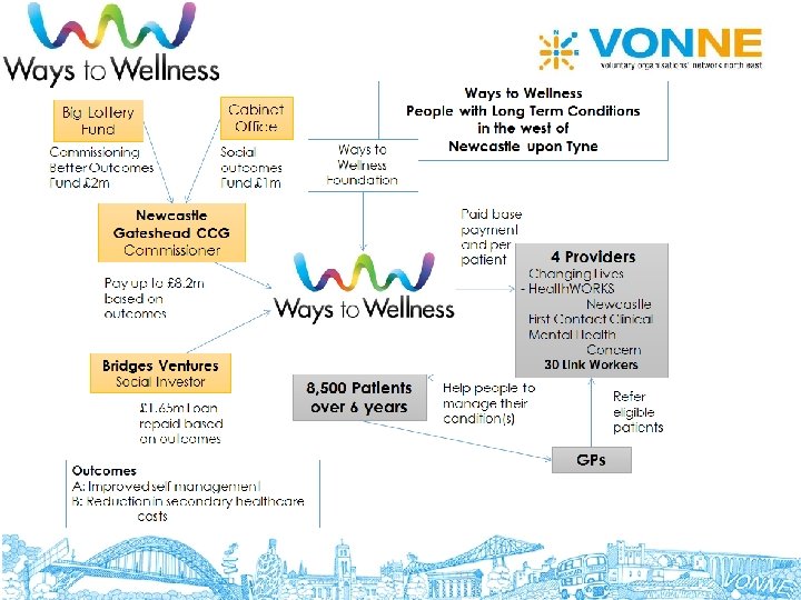 The development of Ways to Wellness • It took a long time (4 years) and a lot of resource (£ 500, 000, plus pro bono) • It concerns a national problem • It was rooted in many years of ‘pilot’ experience • It isn’t just about the money, but it is a lot about the money • Key strengths of the development team: Stick-ability, resilience, nerve, personal credibility, the right skills mix • Newcastle is a small place – well placed individuals • It was essential to understand clearly the drives, risks and benefits for each stakeholder: ‘to sit in their shoes’