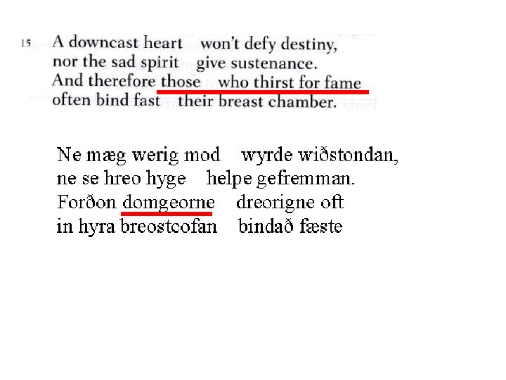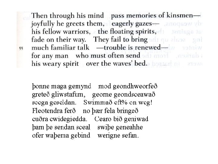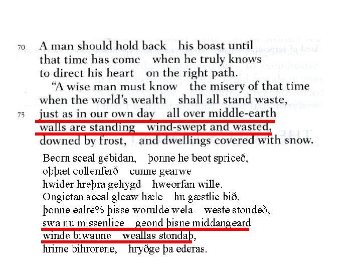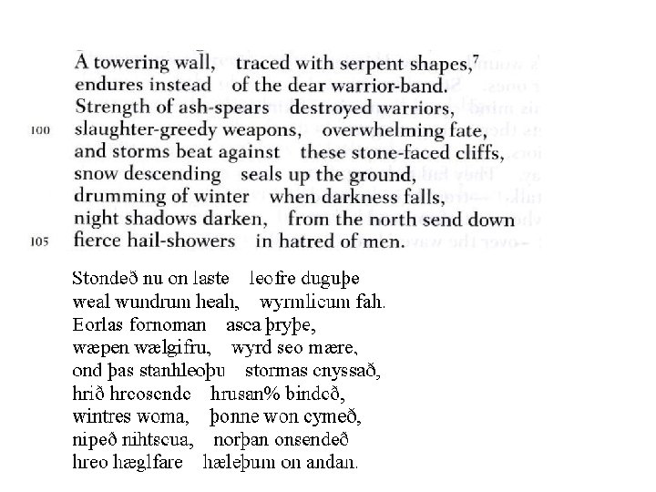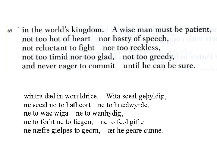 Battle of Maldon (Essex) 991. . . Byrhtwold maþelode, bord hafenode (se wæs eald geneat), æsc acwehte. He ful baldlice beornas lærde: ‘Hige sceal þe heardra, heorte þe cenre, mod sceal þe mare, þe ure mægen lytlað. Her lið ure ealdor eall forheawen, god on greote. A mæg gnornian se ðe nu fram þis wigplegan wendan þenceð. Ic eom frod feores; fram ic ne wille, ac ic me be healfe minum hlaforde, be swa leofan men, licgan þence. ’. . . Byrhtwold made a speech, raised his shield (he was an old retainer), shook his ash-spear. He exhorted the warriors very boldly: ‘Mind must be harder, heart keener, spirit must be greater as our strength diminishes. Here our leader lies all cut down, a good man in the dirt. He who thinks to turn away from this battle-play now will always be able to lament it. I am experienced in life; I do not desire to go, but I intend to lay myself down by the side of my lord, by so dear a man. ’