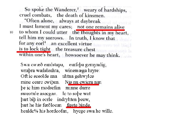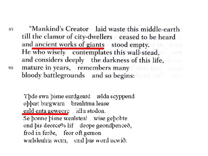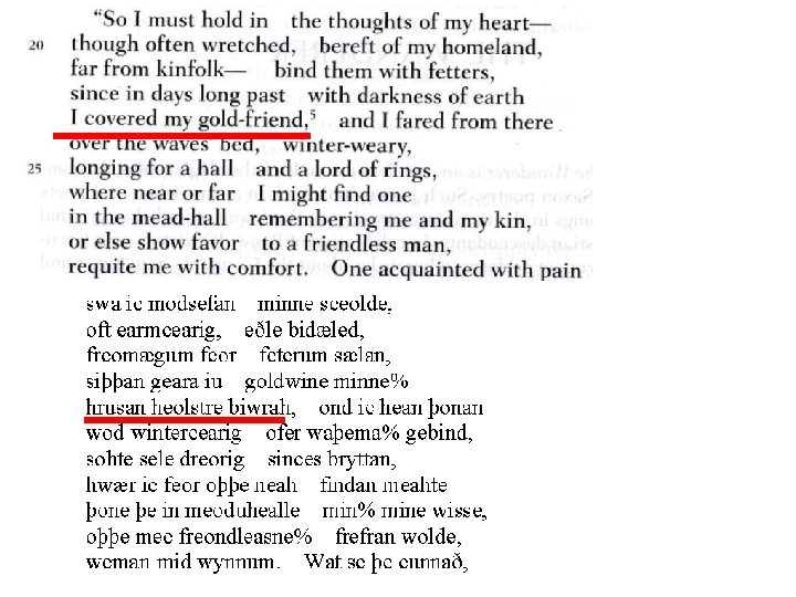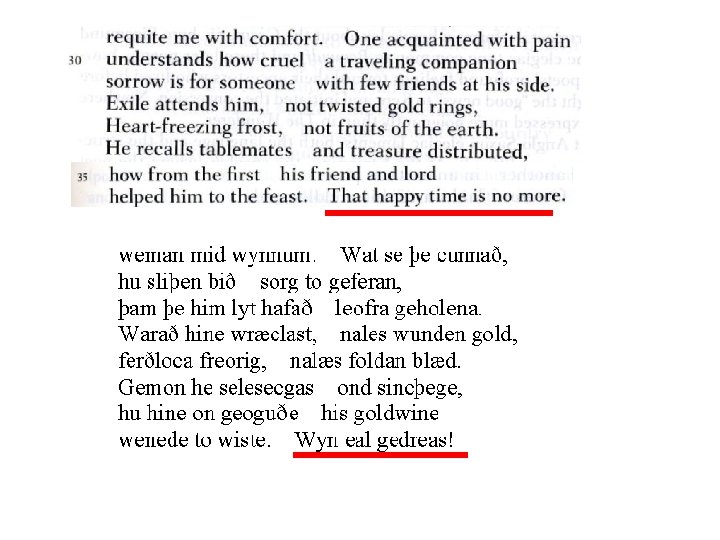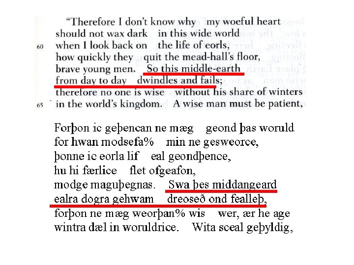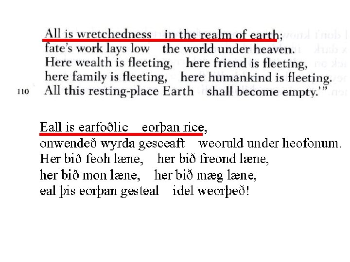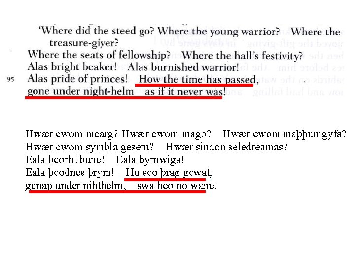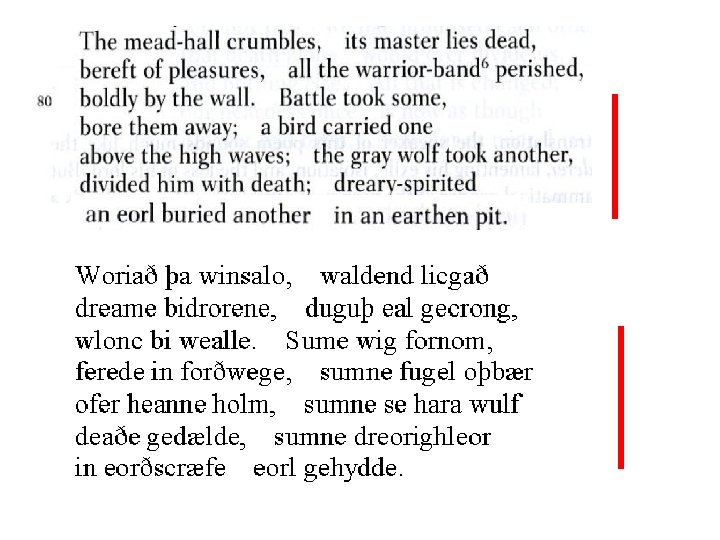 Beowulf 2455 He gazes sorrowfully at his son’s dwelling the banquet hall bereft of all delight, the windswept hearthstone; the horsemen are sleeping the warriors underground; what was is no more, No tunes from the harp, no cheer raised in the yard.