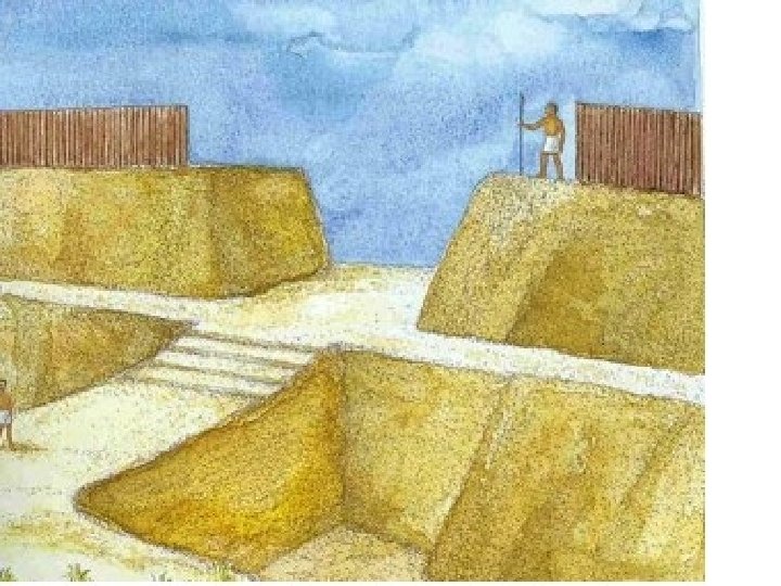 The width of the ditch varies from 12 to 27 meters with an average of 16 meters (52. 5 feet). The average depth is 5. 3 meters or about 17. 4 feet. Webster (1976: 88) states: "To judge from the bedrock outcrops which are still visible, the sides of the trough must have been vertical or near vertical, steep enough to keep attackers from clambering up them. " It would not have been possible to get out of the ditch without a ladder. The minimum width of the bank above the ditch is 10 meters (32. 8 feet). In many places, it is wider. The average height is estimated to have been about 5 feet, Webster indicates that an attacker In the bottom of the ditch would have had to scale a height of about 37 feet to reach the top of the bank. Webster believes there wooden palisades on top of the bank. He states: "I suspect that a palisade may well have existed but that all traces of it have been obliterated. About the only remaining evidence would be a line of post holes or soil discolorations along the outer edge of the embankment.