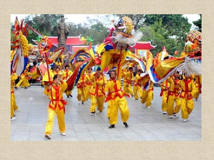 Tet: Vietnamese New Year • Lasts for three days, but many celebrations occur before and after these days • People bring special food to people they want to impress • Follow the lunar calendar for Tet, but follow the solar calendar the rest of the year • A person is considered one year older on this day • A strong emphasis on ancestors • New clothes, houses painted