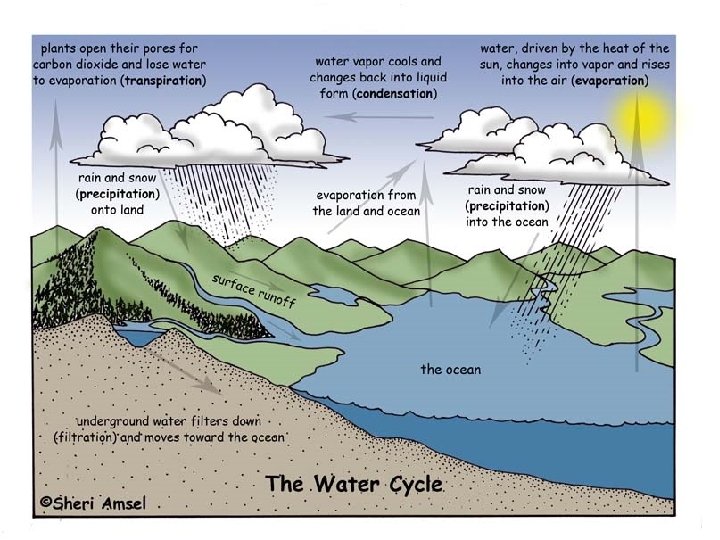 Main Parts A. Evaporation- Liquid to Gas Water changes to water vapor B. Condensation- Gas to Liquid Water vapor cools in the atmosphere and forms small droplets. C. Precipitation- Small droplets of water come together and form large droplets and fall to Earth D. Transpiration- the process by which plants lose water out of their leaves E. Runoff- the movement of land water to the oceans, chiefly in the form of rivers, lakes, and streams Animation: http: //www. epa. gov/ogwdw/kids/flash_watercycle. html