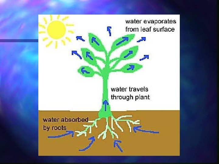 Transpiration Cont. Environmental factors that affect transpiration: n Light n Temperature n Humidity n Wind n Soil water