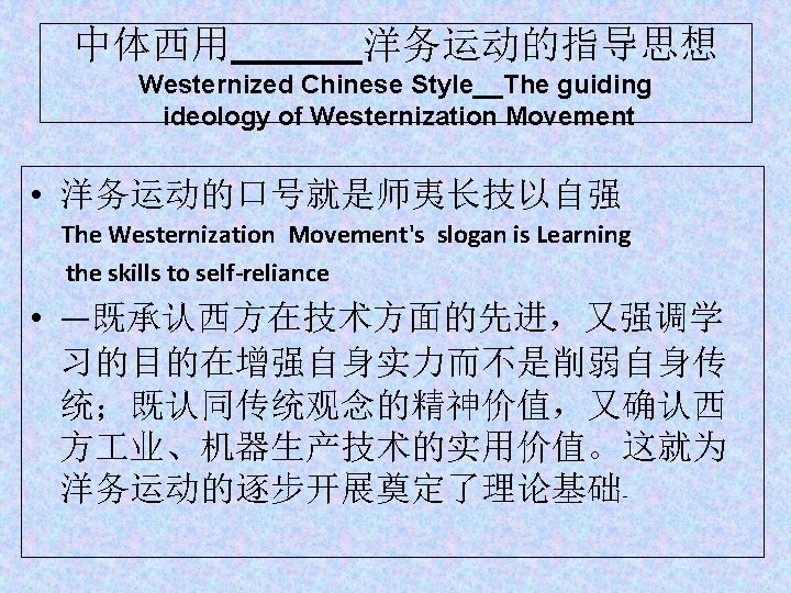 洋务运动失败的教训 The failure of the Westernization Movement 1、独立自主是富强的前提。 Independence is a prerequisite for prosperity. 2、引进最先进科技并避免重复引进与建设 不依赖别人,注重自我创新。 Introduce the most advanced technology and avoid duplication in the introduction and construction , not dependent on others, focus on self-innovation 3、加强领导与科学管理,排除与减少阻力。 Strengthen leadership and scientific management, remove and reduce the resistance