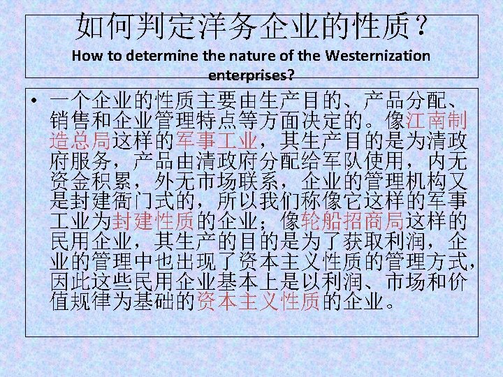 The nature of an enterprise is decided mainly by features such as production purposes, the product distribution, sales and business management. Such as the Jiangnan Manufacturing Bureau military industry, its production was for the Qing government services, products assigned by the Qing government to the military use , within nonaccumulation funds and foreign non-market links, business management organization is bureaucratic feudal style, so We call it such as the feudal nature of the military-industrial enterprises; Steamship such as civilian business, its purpose is to produce a profit, the management company also appears the management of the nature of capitalism, these civilian enterprises are profit, market and the capitalist law of value-based nature of the enterprise, basically.