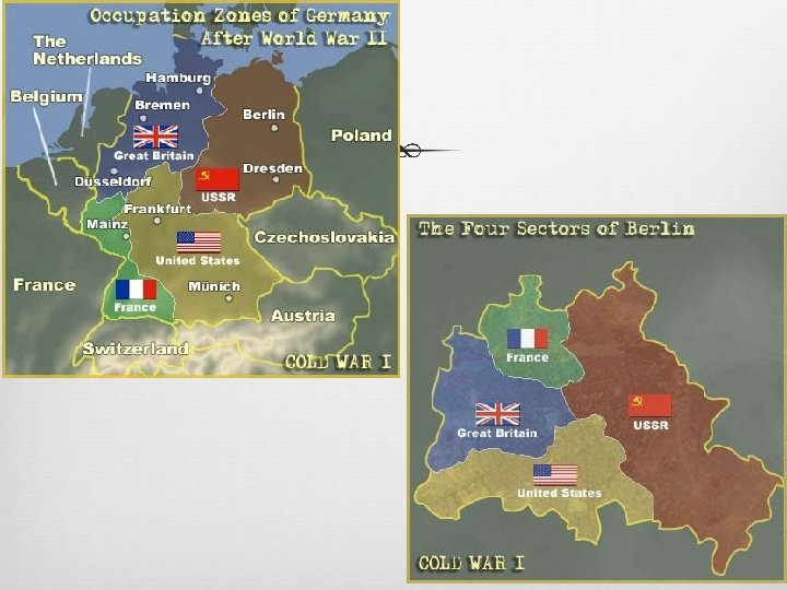 Yalta Conference Continued… Agreed Germany and Berlin would be split into four occupied zones France could have a zone but it would have to from the American and British zones German reparations in the form of forced labor. Citizens of the Soviet Union and of Yugoslavia were handed over regardless of consent. Stalin joined UN