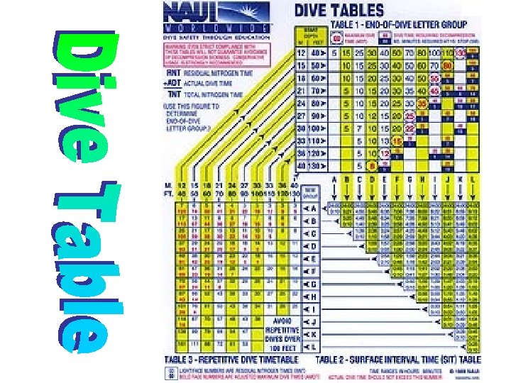 The Importance of Dive Tables • Dive tables allow you to understand your time limits in water due to nitrogen ingassing • Dive tables are essential when you are making more than one dive in a day.