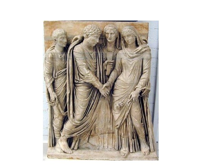 Bridal Procession in mosaic showing Philonoe about to wed Bellerophon; though they are characters from Greek mythology, the scene reflects a Roman wedding. The shy bride, assisted by her mother or a pronuba, is dressed in a saffron tunic with a wedding wreath hovering symbolically over head. The groom stands on the right holding Pegasus, the winged horse. Between them stands painted on a terracotta urn. Four women are pictured: the mother at left Philonoe's father, Iobates, king of Lycia. Roman Tunisia. From the "House of the Nymphs. " 4 th century CE. Nabeul Archaeological Museum. (? ), pronuba at right (? ), musician with drum and the anxious‐looking veiled bride in the center. The bride wears a special garment for the ceremony called the tunica recta or regilla, traditionally woven in one piece on an upright loom. The urn was made for a tomb. Centuripe, 3‐ 2 century BCE. NY: Metropolitan Museum of Art.