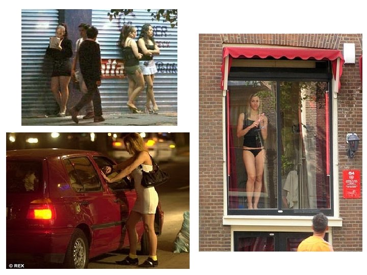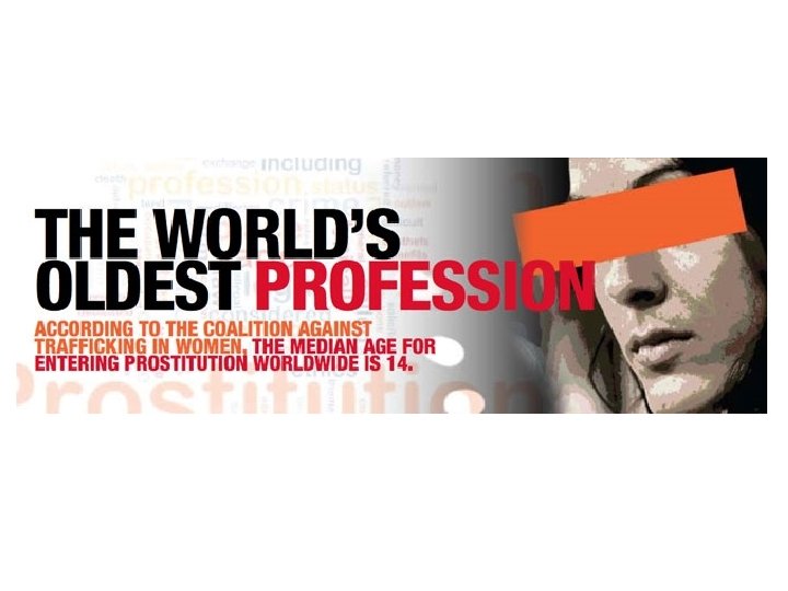 Prostitution Myths Prostitutes are just “Girls from the Wrong Side of the Tracks” § Prostitutes don't fit a singular profile — not all are drug-addled victims of abuse, nor are they all living a happy-go-lucky Pretty Woman lifestyle. § They're not always even women. Male prostitutes have existed alongside their female counterparts since ancient Mesopotamia. • • • There are women who have left the corporate world and carved out a business as sex workers and command thousands of dollars per visit. There are street-level prostitutes who, lacking skills or other job opportunities and regularly possessing addictions, turn to prostitution and earn just a few hundred dollars a week. But prostitution is increasingly tied to sex trafficking. • • In Madrid, 90 percent of its 50, 000 prostitutes are immigrants, and 70 percent of that figure are sex slaves. Disquieting numbers of children are being pulled into the trade as well: at least a quarter of adult prostitutes in the United States started as children. Many of these children are bribed, kidnapped or coerced into becoming prostitutes. – The average of female entry into prostitution is 12 -14 years old; for males, it's 11 -13 years old