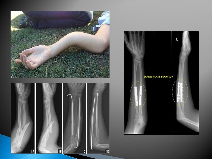 Colles’ Fracture Cause: fall on outstretched hand forces the wrist into hyperextension. The most common forearm fracture. Distal Radius Fracture. Signs & Symptoms: visible deformity, pain, swelling, quick accumulation of blood. Median nerve damage is possible if the radius shifts forward enough Care: Splint & immediately refer for x-ray & physician consult. Ice. Typically casted for 4 -8 weeks. Fracture deformity is usually reduced under anesthesia.