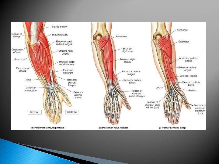 Muscles of the Forearm Muscles (anterior): Muscles (posterior): ◦ Biceps Brachii ◦ Triceps Brachii ◦ Brachialis ◦ Anconeous ◦ Pronator Teres ◦ Flexor Carpi Ulnaris ◦ Brachioradialis ◦ Extensor Carpi Ulnaris ◦ Flexor Carpi Radialis ◦ Extensor Digiti Minimi ◦ Palmaris Longus ◦ Extensor Carpi Radialis Longus ◦ Flexor Carpi Ulnaris ◦ Extensor Carpi Radialis Brevis ◦ Flexor Pollicis Longus ◦ Extensor Digitiorum ◦ Pronator Quadratus ◦ Abductor Pollicis Longus ◦ Extensor Pollicis Brevis ◦ Extensor Pollicis Longus