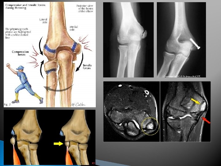 Medial Epicondylitis Cause: repetitive wrist flexion & elbow flexion. AKA as Little Leaguer’s elbow, Pitcher’s Elbow & Golfer’s Elbow Signs & Symptoms: Point tenderness, Swelling over medial epicondyle, Pain with wrist Flexion, Pain radiating down the arm, aching, weakness, point tenderness over medial epicondyle Care: Rest, NSAIDs, Ice, Range of Motion exs, stretching, strengthening, Counterforce brace. Return to play through throwing program if athlete is an overhead thrower, Severe cases may require splinting