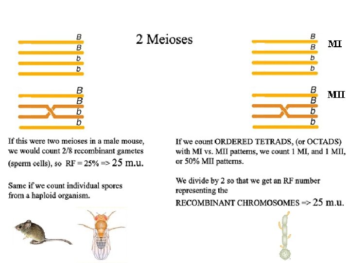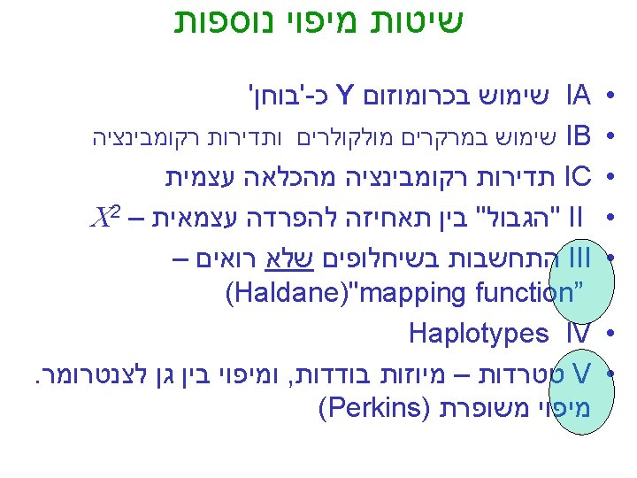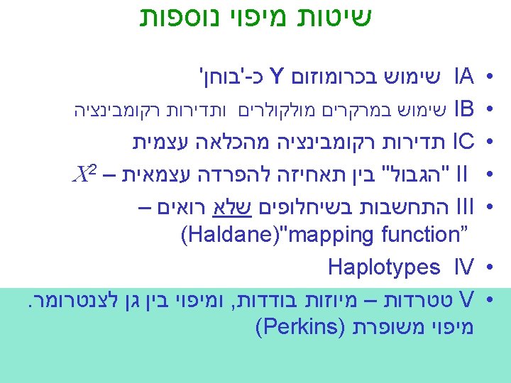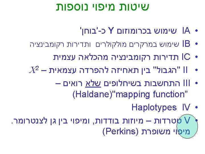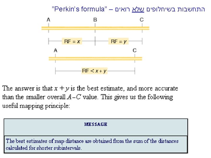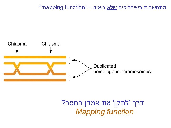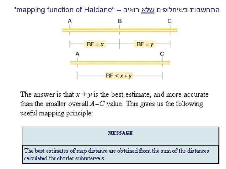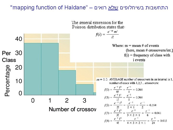 "mapping function of Haldane” – התחשבות בשיחלופים שלא רואים • POINT 1: Between two genes in meioses: *If no crossovers occur, no recombinants result. *If one or more crossovers occur, 50% of the offspring will be recombinant (not intuitive). • POINT 2: From RF, we can derive the class of zero crossoversus 1 -or-more crossovers, using. . . • POISSON - predict the Gaussian curve of classes of crossovers, especially CLASS of ZERO crossovers, and calculate a corrected map distance – *The average number of crossovers between 2 genes.