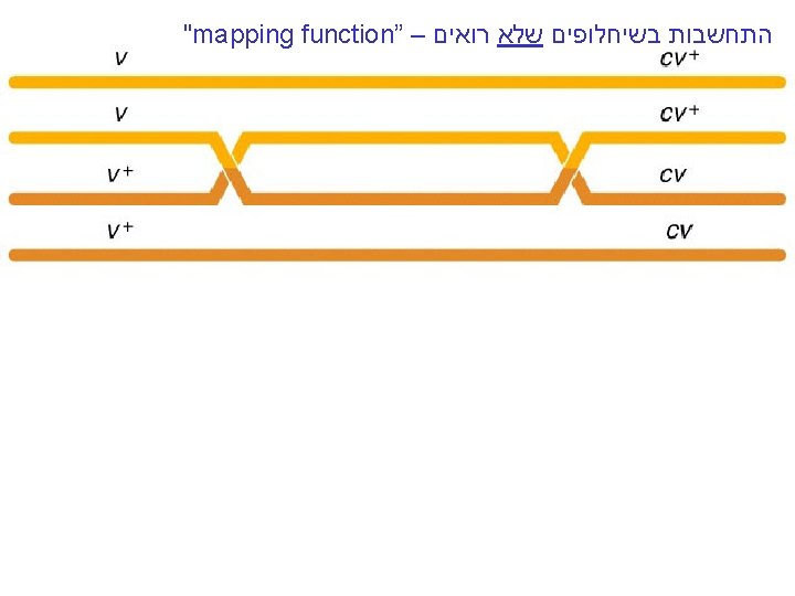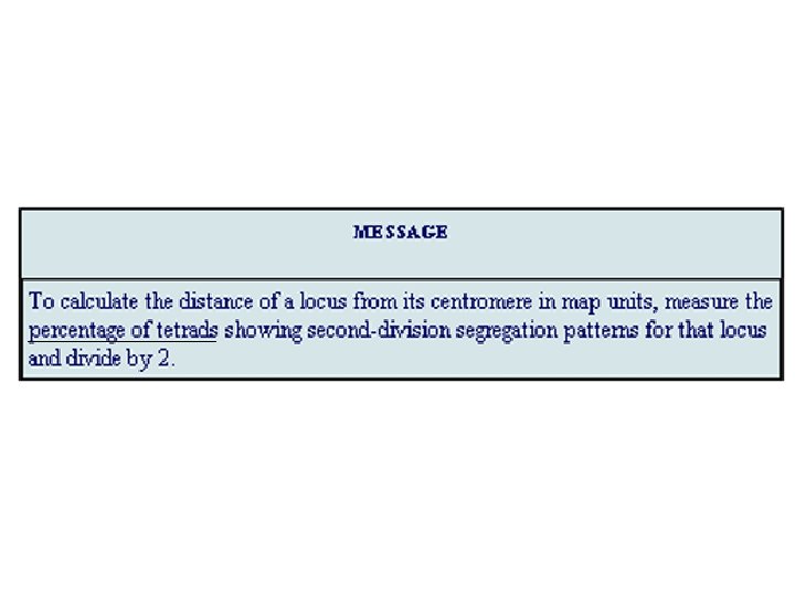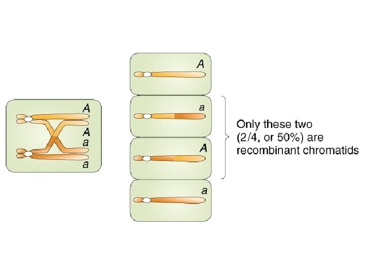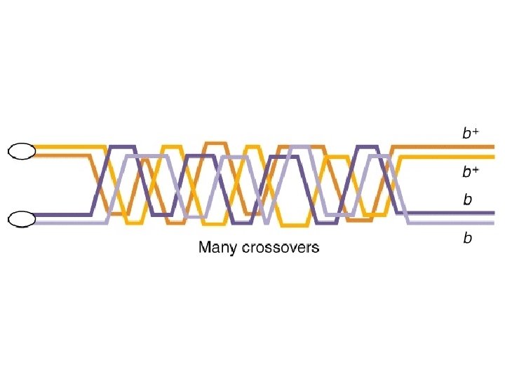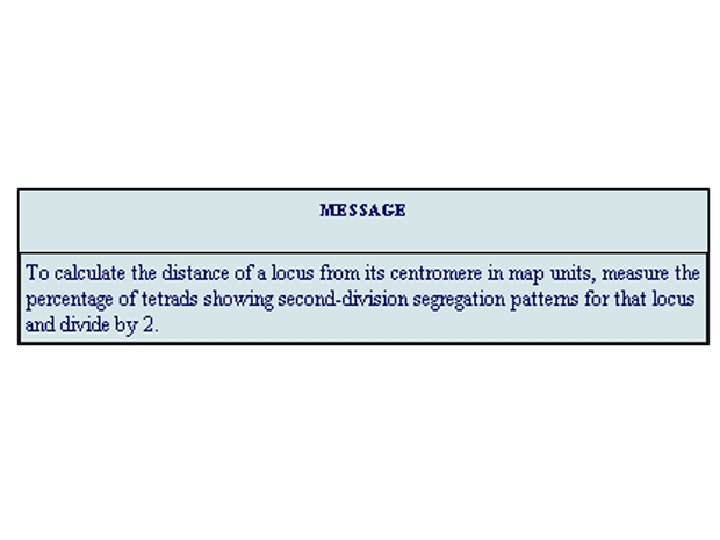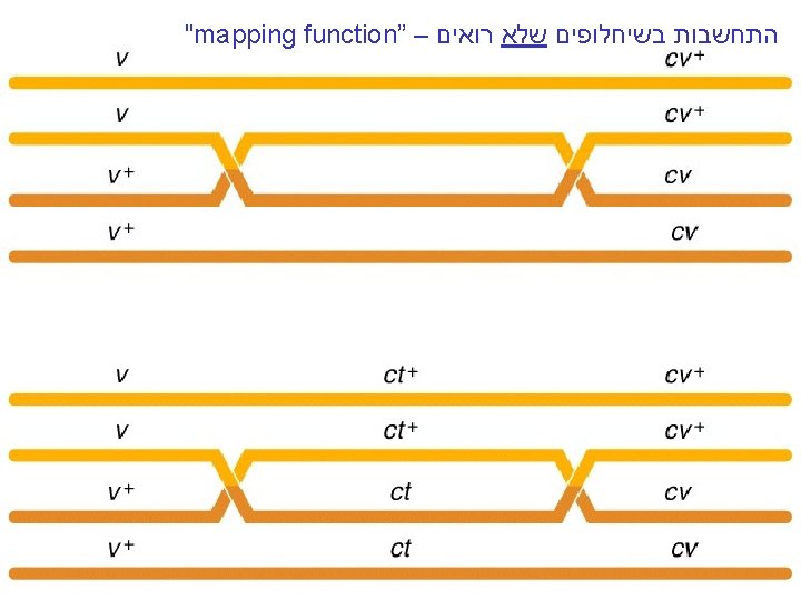"mapping function of Haldane” – התחשבות בשיחלופים שלא רואים • POINT 1: Between two genes together in meioses: *If no crossovers occur between them, no recombinants result. *If one or more crossovers occur, 50% of the offspring will be recombinant (not intuitive). • POINT 2: From RF, we can derive the class of zero crossoversus 1 -or-more crossovers, using. . . • POISSON - predict the Gaussian curve of classes of crossovers, especially CLASS of ZERO crossovers, and calculate a corrected map distance – *The average number of crossovers between 2 genes.