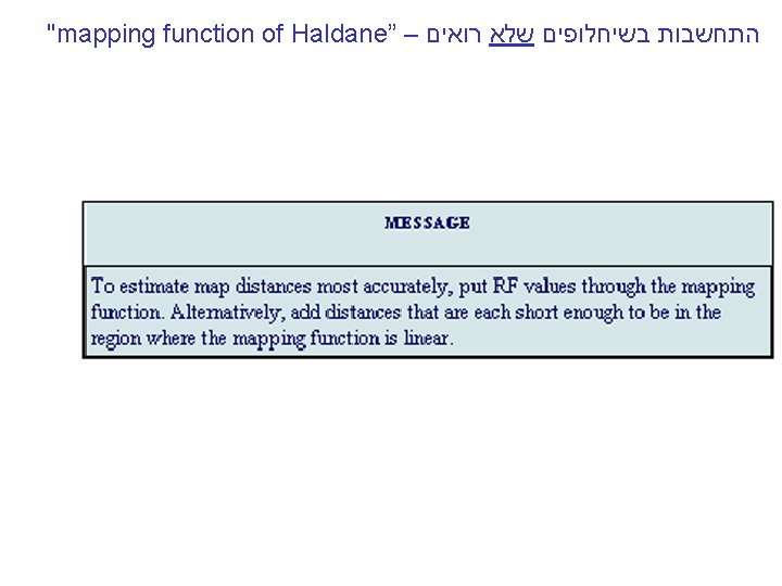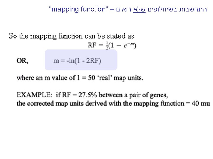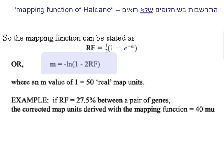 "mapping function of Haldane” – התחשבות בשיחלופים שלא רואים The larger m get e-m tends to 0 and RF tends to 1/2 , or 50 m. u m-is the mean number of cross overs that occur in a segment per meiosis