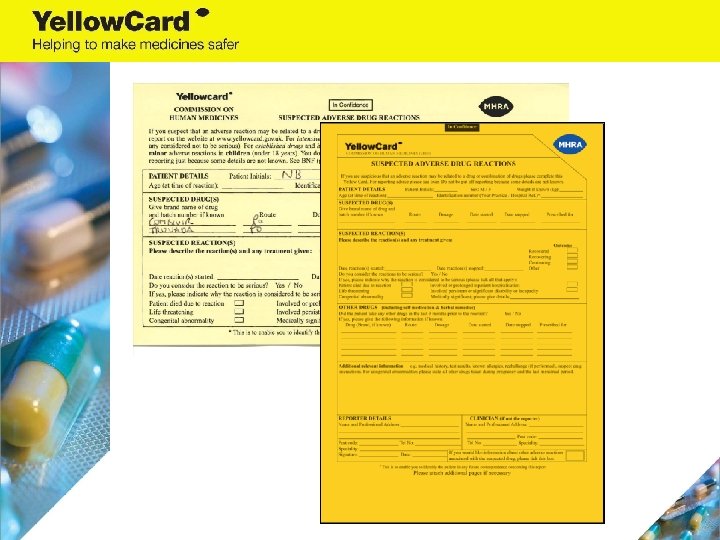 The Yellow Card Scheme • Introduced in 1964 after thalidomide tragedy • Spontaneous reports of suspected adverse drug reactions. • Acts as an early warning system to identify ADRs and risk factors • Over 600, 000 confidential reports have been received in UK • Doctors, dentists, pharmacists, coroners, nurses, midwifes, health visitors • Non-medical prescribers • and now patients • MHRA can detect duplicate reports