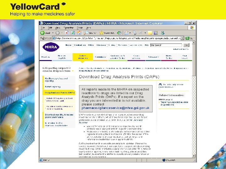 Drug Analysis Prints (DAPs) • Complete list of all suspected ADRs reported via yellow card scheme for named suspect drug • Inclusion of a particular reaction does not necessarily mean it has been caused by the drug • Certain reported reactions are conditions which occur spontaneously • Should not be used for determining incidence • Reporting rates are influenced by seriousness of ADR, ease of recognition, extent of use www. mhra. gov. uk/daps