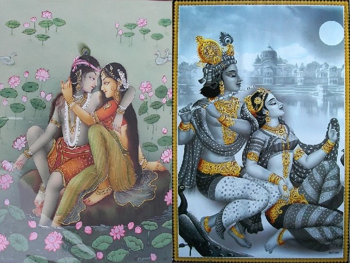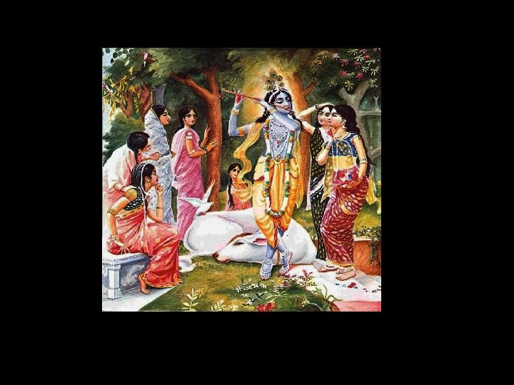 Srimad Bhagavatam (4 th – 6 th centuries CE): Krishna as the flute playing cow herder attracting the gopis (milkmaids) of Vrindavana. Krishna is presented as the Supreme Being who descends to earth to destroy demons and protect the righteous, but his madhurya (sweetness) qualities are also emphasized, i. e. , his attractive human qualities that engender intimacy and hence are essential to the cultivation of various moods of bhakti (loving devotion to God).