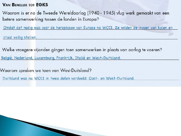 D: Europa groeit GROEPSWERK 1) Teksten lezen bronnenboek p. 13 – 14 2) Werkboek aanvullen p. 11 – 13 bovenaan (kladschrift) 3) Eventueel bijkomende zaken opzoeken op internet.