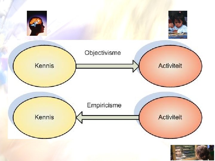 Objectivisme - instructie Lakoff (1987) “An objectivist educator believes that there is one true and correct reality, which we can come to know following the objective methods of science. By studying the world we can identify its structure and entities with their properties and relations, which we can then represent, using theoretical models and abstract symbols. ” Rogoff (1994, p. 211): • Leren het ‘product’ van onderwijzen. Volwassenen verantwoordelijk voor het “vullen” van kinderen met kennis. • aandacht naar de inhoud en niet activiteit.