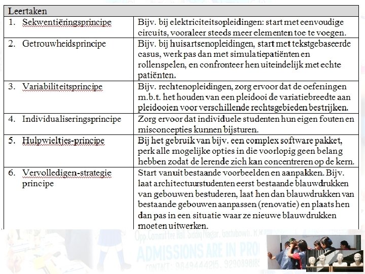 4 C-ID model • Leertaken: complexe en authentieke taken, waaraan alle andere instructiecomponenten worden opgehangen; gegroepeerd in taakklassen. • Ondersteunende informatie: voorwaardelijke achtergrondinformatie. • ‘Just-in-time’ informatie (JIT): extra informatie om routinematige deelaspecten van de hoofdtaak aan te pakken. Alleen beschikbaar op het moment dat ze essentieel is. • Deeltaakoefening: aspecten inoefenen die onderdeel zijn van de taken. Schema’s beter automatiseren.