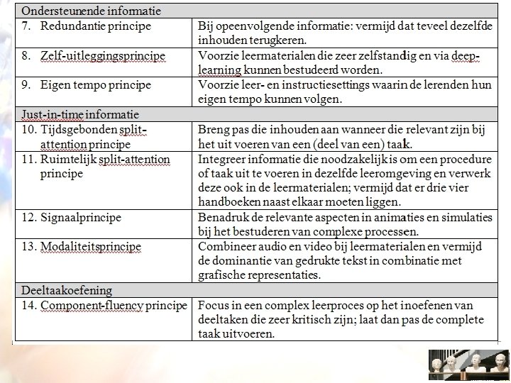 SOI-model van Mayer • Verzorgen multimediale presentatie leermaterialen (zie de 7 designprincipes). • Ondersteunen organisatie leermaterialen. Verzorgde uitwerking leermaterialen an sich voldoende om organisatieactiviteit uit te lokken. Mayer benadrukt verder dat de ontwerper van de leermaterialen ‘pointers’ kan gebruiken om organisatieelementen in de presentatie beter uit te laten komen. Aandacht ontwerper voor het benadrukken van structuur in leermateriaal: bijv. volgorde, aantal stappen, oorzaakgevolg, opeenvolging, samenhang, hiërarchie. • Ondersteunen integratie nieuwe kennis en voorkennis. Vooral gestimuleerd door gebruik te maken van grafische elementen, het stellen van tussenvragen en het gebruik van metaforen.