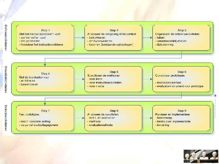 Dick & Carey: 9 stappen • Stap 1: Bepalen van de leerdoelen – Bepaal einddoelen. – Voer behoefteanalyse uit; betrek actoren in dit proces. • Stap 2: Analyse van de instructiesituatie – – Bepaal hoe lerenden uiteindelijk een doel zullen bereiken. Taakanalyse. Informatieverwerking analyse. Leertaken analyse. • Stap 3: Bepaal het startgedrag en de kenmerken van de lerende – Bepaal voorkennis en voorwaardelijke procedures. – Besteed aandacht aan hogere orde denkvaardigheden, persoonlijkheidskenmerken, houdingen en kenmerken van de lerenden.