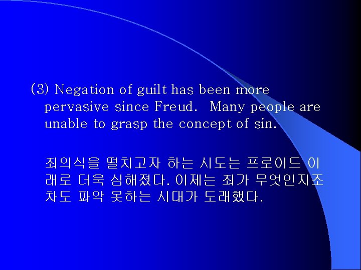 (1) Sin is not a pleasant subject. It depresses us and can hurt our selfimage. Therefore, positive thinkers are reluctant to discuss on sin. l 생각만 해도 인간의 마음을 불편하게 하고 인 간관에 해가 되는 주제라고 생각하기 때문에 긍정적인 사고를 강조하는 사람들은 죄에 대 해 언급하기를 싫어한다.